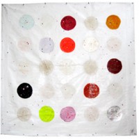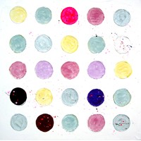 Acrylique, crayon, sun-paint sur toile. Cette œuvre exploite un procédé de peinture photosensible. Les points sont des couleurs fixes, soit des couleurs translatives qui apparaissent et disparaissent à l’exposition solaire. 20x20cm