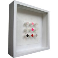 Acrylique, crayon, sun-paint. Cette œuvre présentée dans une boite, exploite un procédé de peinture photosensible. Les points sont des couleurs fixes qui émergent en 3D et couleurs translatives qui apparaissent et disparaissent à l’exposition solaire.