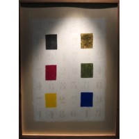 Acrylique sur carton, tissu, feuille d’or, film miroir, MA2F-SUN-PAINT PROCESS© (procédé de peinture photosensible), crayon. Les carrés sont de couleurs fixes, seuls les chiffres apparaissent et disparaissent à l’exposition solaire.